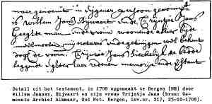 ![]() Vermeldenswaardige gegevens: • Beroep: Meelmolenaar, 1708-1735, Bergen, , Noord-Holland, Netherlands. ![]() Willem trouwde met Trijntje Jansdr. in 1700. (Trijntje Jansdr. overleden in 1730 in Bergen, , Noord-Holland, Netherlands 5.) |