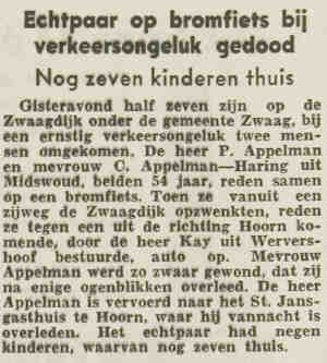 Another name for Petrus was Piet Appelman. ![]() General Notes: Dit echtpaar krijgt 9 kinderen. ![]() Petrus married Cornelia Haring, daughter of Jan Haring and Dieuwertje Hoogland, on 15 Apr 1925 in Nibbixwoud, , Noord-Holland, Netherlands. (Cornelia Haring was born on 3 Jul 1903 in Nibbixwoud, , Noord-Holland, Netherlands 3,22 and died on 14 Jul 1957 in Nibbixwoud, , Noord-Holland, Netherlands 3,22.) |